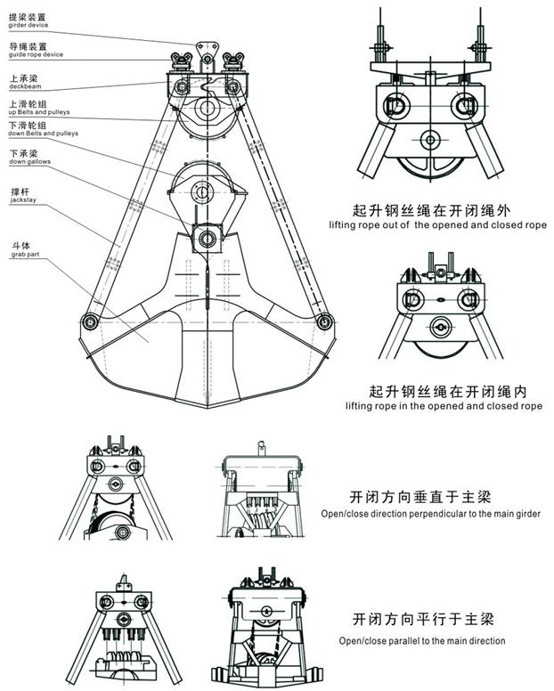 Работата започва, подкрепа стомана въже ще повдигне кофата вземете на добре място, а след това изключите опората въже, разчитат на мъртвите тежестта на долния лъч принудени надолу лъч голям вал като център отвори тялото вземете. Когато двата уши не се разбият, тялото се отваря максимално. При отварянето на кофата се увеличава централното разстояние на въртящата се ролка и надолу на ролката. След това опорното въже се спусна, отворената кофа за падане попадне върху залепените по-горе материали и се напълни около отвореното и близкото въже, снопа на въртящата се греда и разстоянието на дръжката на дръжката надолу се връщат в оригиналната позиция, като по този начин завършват улавянето процеса на вземане на материали. При последното повдигане и затваряне на въжето и опорното въже едновременно, цялата кофа за повдигане се повдига, в зависимост от крана, преместете кофата за хващане до извода за разтоварване, който разтоварва материалите.